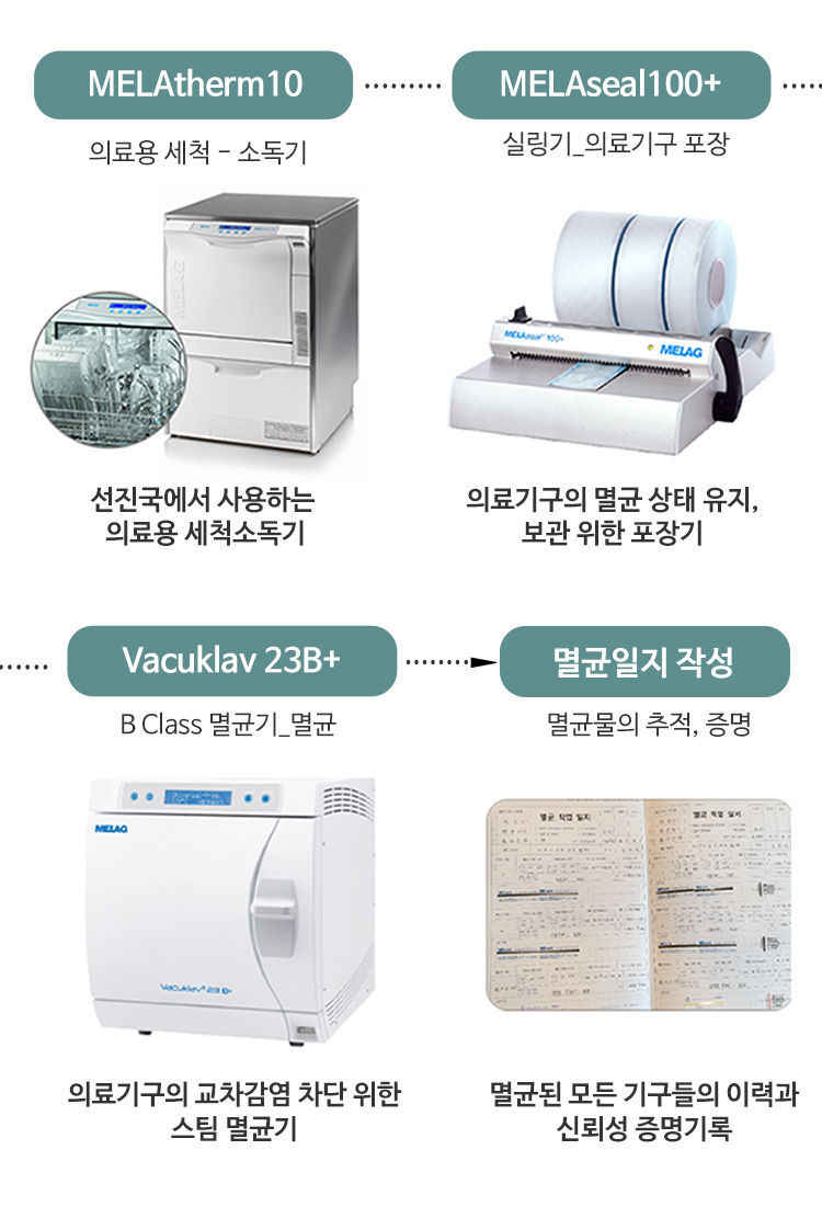 진료에 사용되는 모든 기구와 장비들을 CDC(미국 질병관리본부), WHO(세계보건기구) 기준에 따른 9단계 멸균 프로세스로 철저히 관리하고 있습니다.