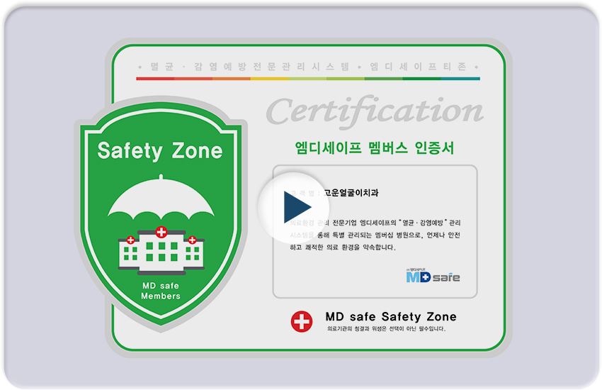 감염차단솔루션을 제공하는 의료환경관리 전문기업 엠디세이프의 전담 관리자가 정기적으로 고운얼굴 이치과에서 대표원장과 직원들 모두에게 치과 내 감염관리에 대해 교육하고 전직원들 모두 적극적으로 임하고 있습니다.