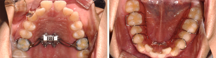 상악골이 횡적으로 좁은 것이 주원인인 경우 급속구개확장장치를 이용해