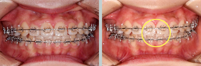 측절치가 앞으로 넘어오면 교정장치를 부착해 다른 치아들과 함께