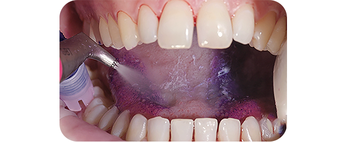 충치와 치주염을 일으키는 세균막(바이오필름)과 치석이 있는 부위는 보라색으로 염색되어 시술자와 환자 모두 알 수 있습니다.